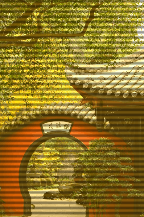 In this example, we apply heavy color correction and display-style artifacts to a traditional Asian garden PNG. We increase the red channel by 100 and the green channel by 70 to give the environment a warm, yellowish tint. Additionally, we set the scanline intensity to 40, which mimics the horizontal lines seen on analog TV screens or surveillance monitors, adding a unique industrial texture to the PNG image. (Source: Pexels.)