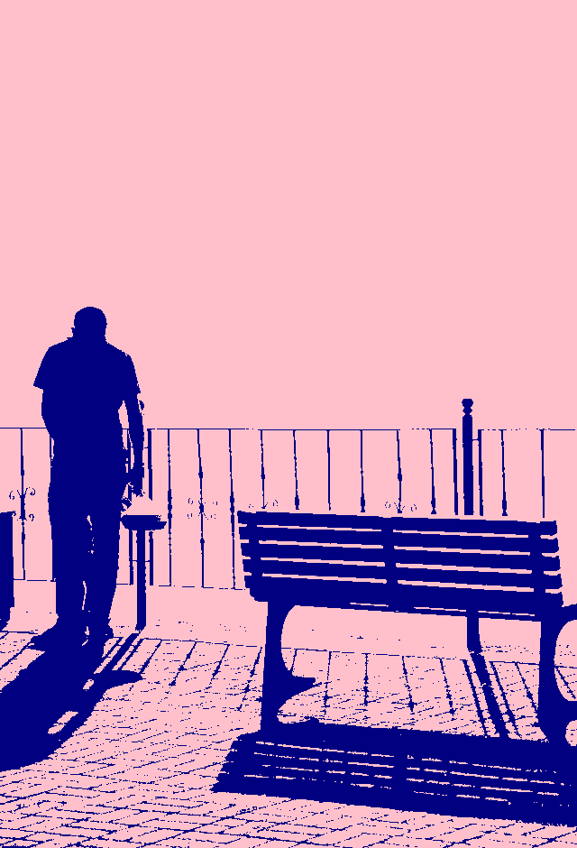 In this example, we isolate shadowed regions in a PNG image. With the threshold set to 20%, the person, bench, fence, and paving outlines form strong silhouettes against the lighter background. We apply custom colors by displaying dark pixels in navy and non-dark pixels in pink, creating a clear contrast that separates shaded areas from the rest of the image. (Source: Pexels.)