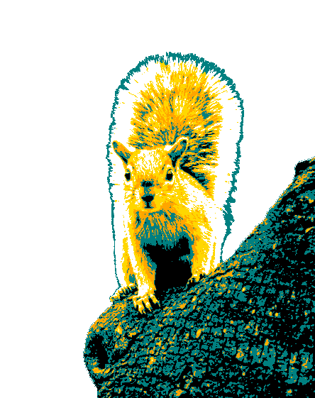 In this example, we transform a grayscale PNG of a squirrel on a tree into a colorful illustration. We define a palette of seven colors, including warm golden tones, cooler teal shades, and a transparent color. By reordering the colors in the list, we control which areas of the squirrel and tree are filled, while keeping the background transparent. (Source: Pexels.)