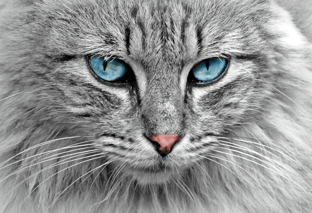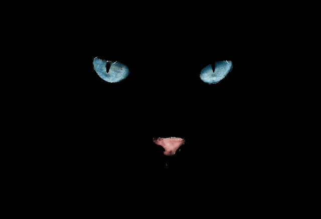 In this example, we identify grayscale pixels in a cat PNG and generate a mask that marks only those areas. By setting the threshold to 20, pixels whose R, G, and B values differ by no more than 20 are treated as grayscale. These pixels are replaced with solid black, while all colored pixels remain unchanged. The result is an image where only the cat's blue eyes and pink nose stand out against a completely black background. (Source: Pexels.)