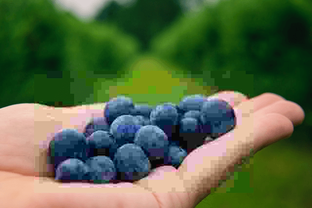 In this example, we add JPEG artefacts to a rectangular area of a PNG photo with blueberries. We enter the artefact level equal to 95% and get a PNG with rough square pixels in the middle of the photo. (Source: Pexels.)