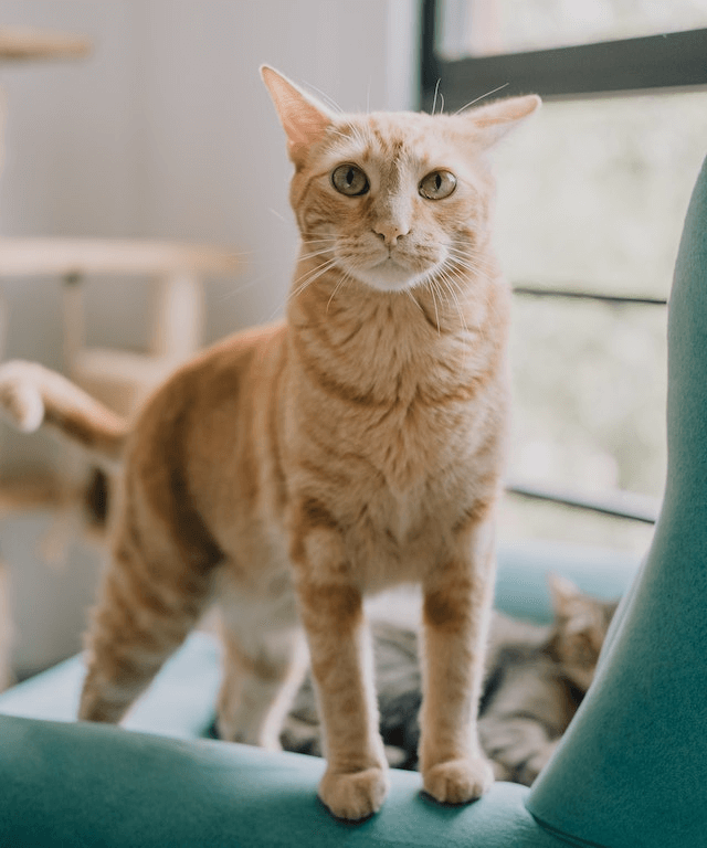 This example creates a dithered 3-bit (8-color) grayscale PNG photo of an orange-furred cat standing on an armchair. It uses the "False Floyd Steinberg" algorithm but before it's applied, all color pixels are turned into grayscale pixels. (Source: Pexels.)