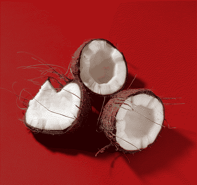 In this example, we apply dithering to a multi-color PNG image of coconuts on a red background and convert it to a 4-color tone PNG. We choose the Stucki algorithm and get a surprisingly accurate approximation of the original image. (Source: Pexels.)