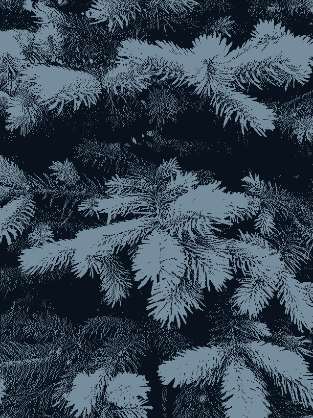 In this example, we add dithering to a PNG image of a coniferous tree and reduce the original color palette as much as possible to just two colors. The color reduction algorithm analyzes the image and finds that the two most popular colors are the conifer-green and silver-white and these are the two colors that go in the new quantized color palette. The dithering method that we use is Floyd-Steinberg and it takes the two colors in the color palette and scatters pixels in such a way to recreate as many details of the original PNG as possible. The dithering algorithm itself is independent of the color palette, which is created via quantization in the previous step. (Source: Pexels.)