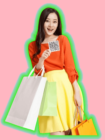 In this example, we add a bright glow to a woman holding shopping bags. We use the exponential dropoff type glow and set two colors. The first color, lime green, has an opacity of 180 at the edge of the woman's body and then fades to lightskyblue, which is fully transparent at 20 pixels away. We also add a solid pink background to the PNG image. (Source: Pexels.)