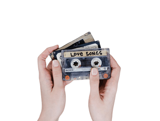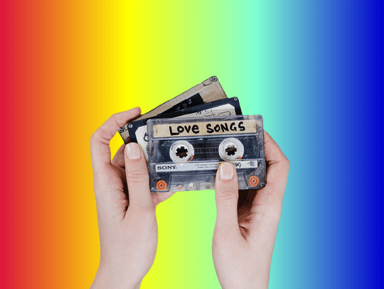 In this example, we use the linear gradient type and four bright colors to create an iridescent background for a PNG file showing old audio cassettes. The linear gradient applies the color changes horizontally from left to right. The colors change from crimson to yellow to aquamarine to mediumblue. (Source: Pexels.)