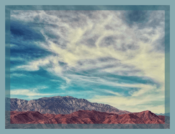 This example adds a 40-pixel centered border to a PNG image of a cloudy day in the mountains. 20 pixels of the border are drawn outside of the image and the other 20 are drawn on the inside. The border is filled with a blue semi-transparent color rgba(58, 112, 121, 0.6), where the alpha value of 0.6 means that the color is 60% opaque and 40% transparent. The inner and outer sides of the border are clearly visible through the translucent pixels. (Source: Pexels.)
