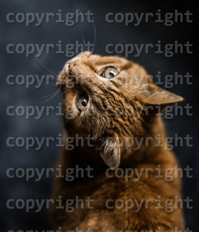 In this example, we add a copyright watermark to a PNG image of a ginger cat. We write the word "copyright" in the options and repeat it 16 times so that it occupies the entire area of the image. We use the monospace font for the copyright message, set its size to 58 pixels, and print the letters in white color with 80% transparency. We also add a black shadow to the letters, using the shadow format "5px 5px 5px black". (Source: Pexels.)