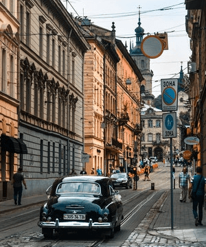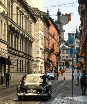 In this example, we split a PNG image of a city street into two parts. We leave the right part as it is and make the left part have 100% sepia tones. As a result, we get a half-retro, half-modern photo of the same street that looks like it was taken in different centuries. (Source: Pexels.)