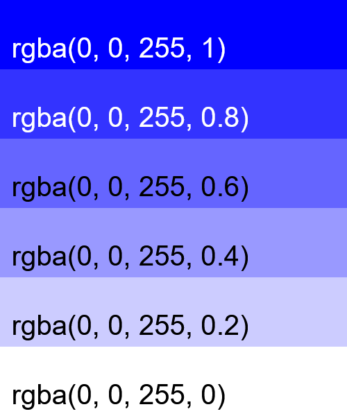 In this example, we blend an opaque color (blue) with a completely transparent color using perceptual blending. We generate four midpoints (intermediate shades) to create a smooth fade. The first color, as specified in the options, has full opacity (alpha channel value of 1). The generated colors then show a progressive reduction in opacity: one color has an alpha of 0.8 (20% transparent), the next has an alpha of 0.6 (40% transparent), the third has an alpha of 0.4 (60% transparent), the fourth has an alpha of 0.2 (80% transparent), and the last color (also specified in the options) is fully transparent. This process yields a palette with a smooth, gradual fade where the color slowly disappears until it becomes completely invisible.
