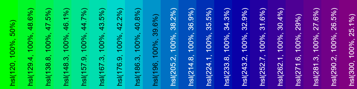 In this example, we create a horizontal gradient between "lime" and "purple" using HSL blending. This method calculates the blend by taking the shortest path on the hue circle. Thus, it passes through a specific range of secondary colors because of the large difference in hue between the two endpoints. Since both "lime" and "purple" start with maximum Saturation (S), all intermediate colors also maintain high saturation. We display the colors horizontally and label each one with its HSL code value. This clearly shows the change in the Hue (H) component from 120° to 300° and the change in the Lightness (L) component from 50% to 25%.