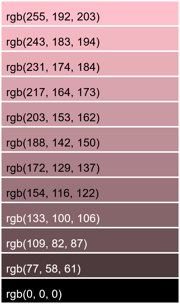 In this example, we mix "pink" and "black" using Linear RGB interpolation, which more accurately simulates the physical mixing of light than standard RGB. Unlike basic RGB averaging, which often results in tones that appear too dark or muddy near the midpoint, Linear RGB provides smoother transitions and better perceived luminosity. We generate ten intermediate shades between pink and black and arrange them vertically in blocks of 600×80 pixels. We also add a small gap between the colors and padding around the entire palette, displayed against a white background.