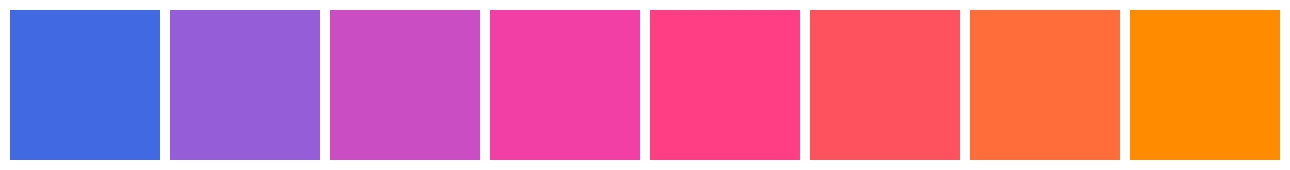 In this example, we blend "royalblue" and "darkorange" using the LCH blend method. This blend method mixes colors in the cylindrical LCH space, which is excellent for vibrant gradients because it typically avoids muddy intermediate shades. We specify 6 midpoints and generate a horizontal palette consisting of 6 square swatches (150x150 pixels) with a 10-pixel gap between them and 10 pixels of padding around the whole palette.