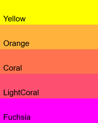 In this example, we blend Yellow and Magenta using the Perceptual mixing method. We set three midpoints and obtain a palette of five colors (including the two chosen ones): Yellow, Orange, Coral, LightCoral, and Fuchsia (which is equivalent to Magenta). The Perceptual method focuses on producing the most natural transitions, similar to how pigments mix in the real world, making the entire palette predictable.
