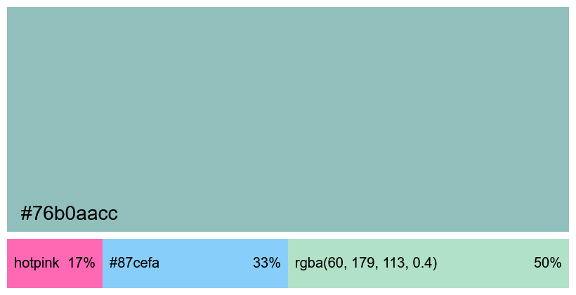 This example computes an RGB average of three colors in different formats with assigned weights: "hotpink" with weight 1, "#87cefa" (light sky blue) with weight 2, and "rgba(60, 179, 113, 0.4)" (semi-transparent medium sea green) with weight 3. The weighted average method makes sure that colors with higher weights contribute more to the final result. As a result, hotpink accounts for about 17%, light sky blue for 33%, and medium sea green for 50%. Additionally, the last color is partially transparent (60% transparent), which affects the overall average of the alpha channel and makes the final color about 20% transparent.