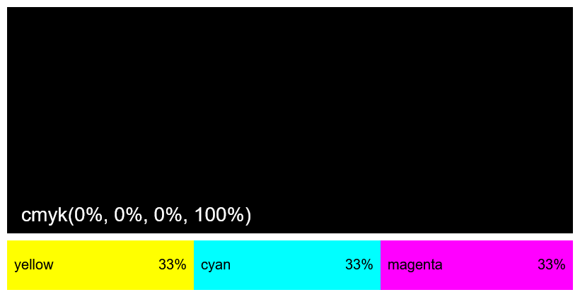 This example uses subtractive averaging to simulate how printing inks behave when layered. Yellow, cyan, and magenta are the primary colors in the CMYK model, and when they are combined in equal proportions, they absorb nearly all light, resulting in a deep black tone. This is also the principle used in computer printing, where CMY inks are combined to produce black.