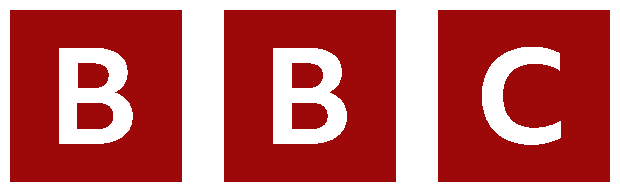 In this example, we convert the well-known BBC logo in black colors into a new red version. We specify the original logo color via its name "black" and enter a dark red shade with the hex code #9d0808 for the replacement. To effectively remove all black pixels, including those that are not perfectly black (such as dark gray pixels used for anti-aliasing), we set the color change coefficient to 10%. (Source: Wikipedia.)