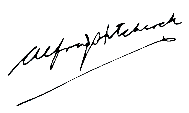 This example applies the signature edge-cleaning algorithm on Alfred Hitchcock's signature. The signature was exported from a JPG photo and it has a lot of JPG artifacts around it, which makes it very ugly. The algorithm finds individual pixels that are surrounded by a transparent background and makes them invisible. It uses simple pixel removal in a radius of 1 pixel as well as deep pixel cleaning in gaps up to 8 pixels with a color threshold of 40% (the "Minimum Color Difference" method). As a result, the blue noisy pixels disappear. (Source: Wikipedia.)