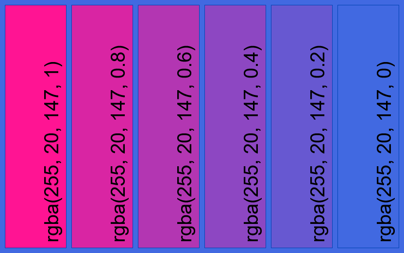 In this example, we layer the deep-pink color with various opacity levels over a royal-blue background. We specify six identical pink colors in RGBA format in the tool options and gradually increase the transparency value of each color by reducing the alpha channel value by 20% (0.2). The first color in the list has an alpha value of 1, meaning it's fully opaque, while the last color has an alpha value of 0, meaning it's fully transparent. As a result, horizontally arranged color strips show a transition from vivid deep-pink to pure royal-blue. Where the pink is partially transparent (strips with alpha channel values of 20%, 40%, 60%, and 80%), it blends with the blue background, creating new intermediate shades. Additionally, each pink shade is labeled with its RGBA code, and each strip is outlined with a thin border for clarity.