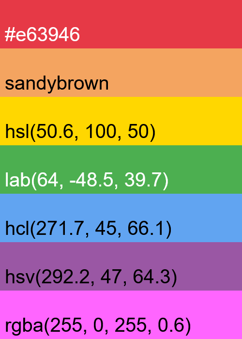In this example, we visualize multiple color formats within a single PNG file. The color formats include the hex code "#e63946" (crimson), HTML/CSS color "SandyBrown", HSL color "hsl(50.6, 100%, 50%)" (gold), LAB color "lab(64, -48.5, 39.7)" (medium sea green), "hcl(271.7, 45, 66.1)" (cornflower blue), "hsv(292.2, 47, 64.3)" (medium orchid), and "rgba(255, 0, 255, 0.6)" (semi-transparent Violet). The program arranges these colors vertically as thin horizontal color strips and adds a label to each color with its original color code or name.