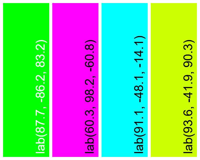 In this example, we create a bright neon palette consisting of four colors defined by the HCL (Hue-Chroma-Luminance) color space model. Each color fills a vertical rectangular sector sized 150 by 500 pixels with the HCL code attached to it, and the sectors are arranged side by side in a row. We also add gaps of 10 pixels between the colors and add 10 pixels of padding around the entire palette.