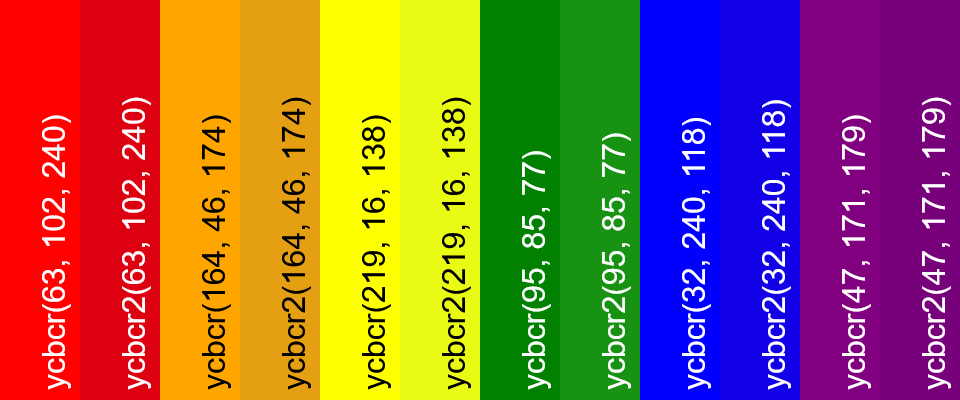 In this example, we show the difference between the standard YCbCr color model and the YCbCr2 function, which extends the YCbCr color model. The YCbCr model typically uses a limited range of values (Y: [16, 235], Cb/Cr: [16, 240]), whereas the YCbCr2 function modifies it to work with the full 8-bit range ([0, 255]) for all three components (Y, Cb, Cr). As you can see, there are slight differences between both pairs of colors. For each color pair, the left color visualizes the limited-range YCbCr model, and the right color visualizes the full-range YCbCr2 function, making it easy to compare how brightness and saturation vary between them.