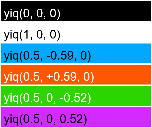 This example demonstrates the YIQ color model by converting several YIQ values into a PNG image. The Y component (luma, which ranges from 0 to 1) controls the overall brightness of the color. The I component (in-phase, which ranges from −0.5957 to 0.5957) controls the hue on the orange-blue axis. The Q component (quadrature-phase, which ranges from −0.5226 to 0.5226) controls the hue on the purple-green axis. To better understand how each component contributes to the final color, we visualize values at the extreme ends of their respective ranges.