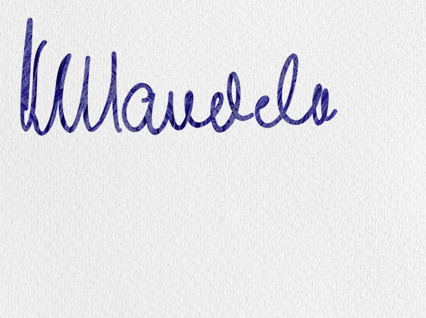 In this example, we upload Nelson Mandela's handwritten signature. It's written with a standard blue pen on regular paper. To convert it into a digital version, we hint the tool its approximate ink color by clicking on the signature in the input editor. Additionally, we increase the color variation range to 50% to make sure both lighter blue and darker blue pixels of the signature get matched. We also further enhance the digital version by recoloring the signature to a solid midnight blue color and increasing its thickness by 1 pixel. Additionally, we slightly smooth the edges of the digital version and crop it to remove the empty paper. (Source: Wikipedia.)