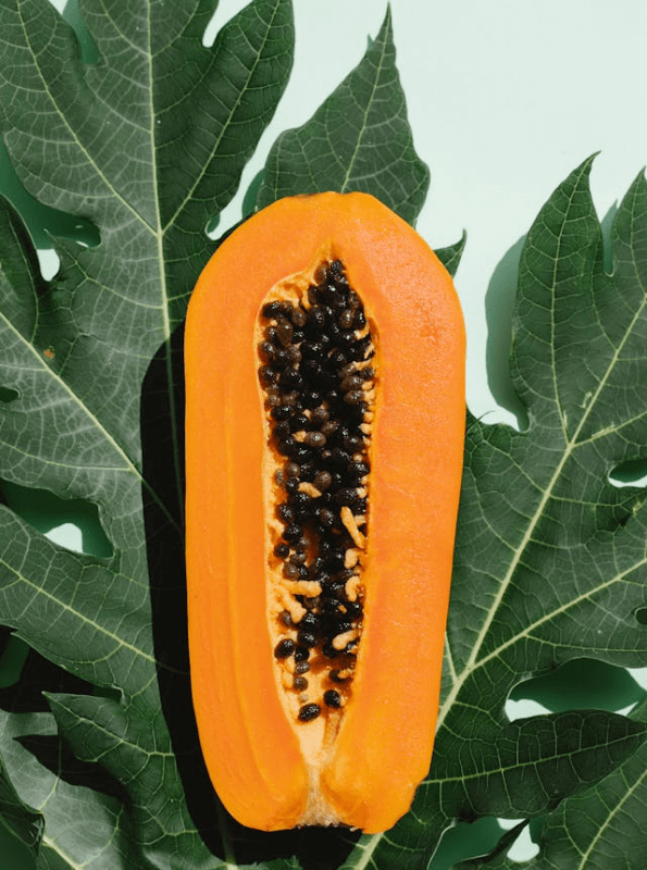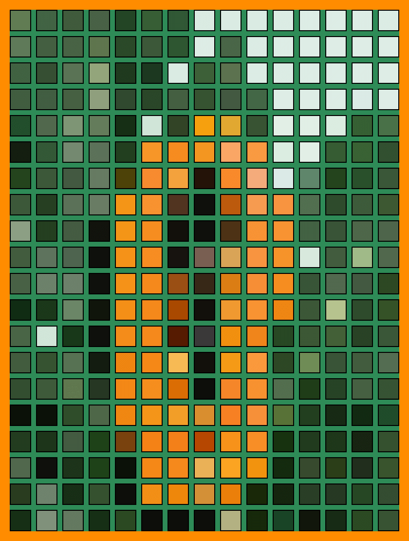 This example splits a PNG image of papaya into large color blocks of size 40×40 pixels, creating vibrant abstract art. Each block is outlined with a 2-pixel thick black border and the blocks are spaced 10 pixels apart. The gaps are filled with a "sea-green" color, which is specified in the options. The entire mosaic is also surrounded by a 20-pixel dark orange padding, which creates the effect of a frame around it. (Source: Pexels.)