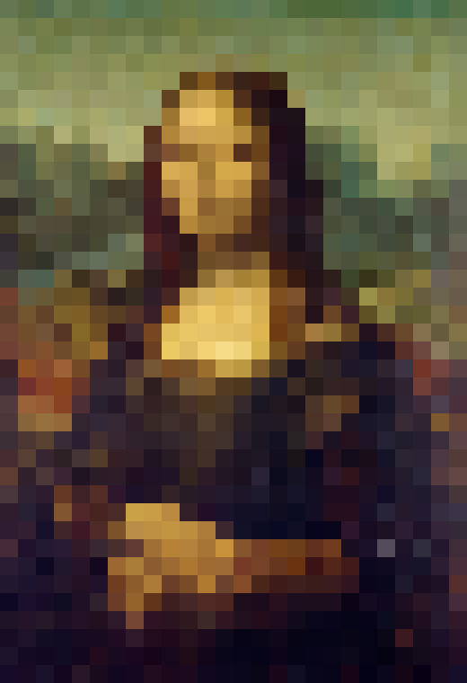 In this example, we transform the iconic Mona Lisa painting into a mosaic of large color tiles, each measuring 20-by-20 pixels. The color of each tile is found by averaging the 20-by-20 original pixels. The tiled version of the Mona Lisa gets a simplified look and still retains its recognizable features. (Source: Leonardo da Vinci.)
