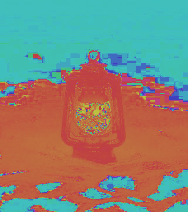 In this example, we convert a PNG image of a lantern lamp into the hue component of the HSL color model. The hue channel accurately portrays the colors of all PNG pixels, utilizing shades from the spectrum of visible light. This allows us to clearly see that the warm light from the lantern creates orange pixels of warmth on a cool blue background. (Source: Pexels.)