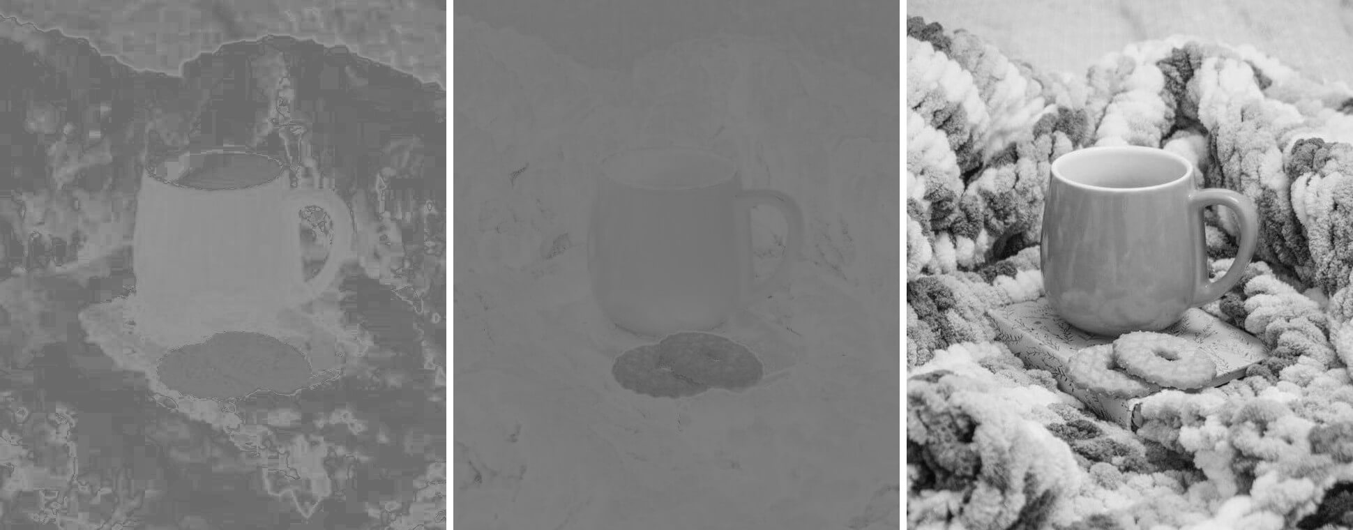 In this example, we generate a monochrome version for each extracted HSL channel. The lightness component, being inherently black and white, remains unchanged in the grayscale filter. However, the hue and saturation components take on a new perspective in shades of gray, offering a unique exploration of the PNG's color composition. (Source: Pexels.)