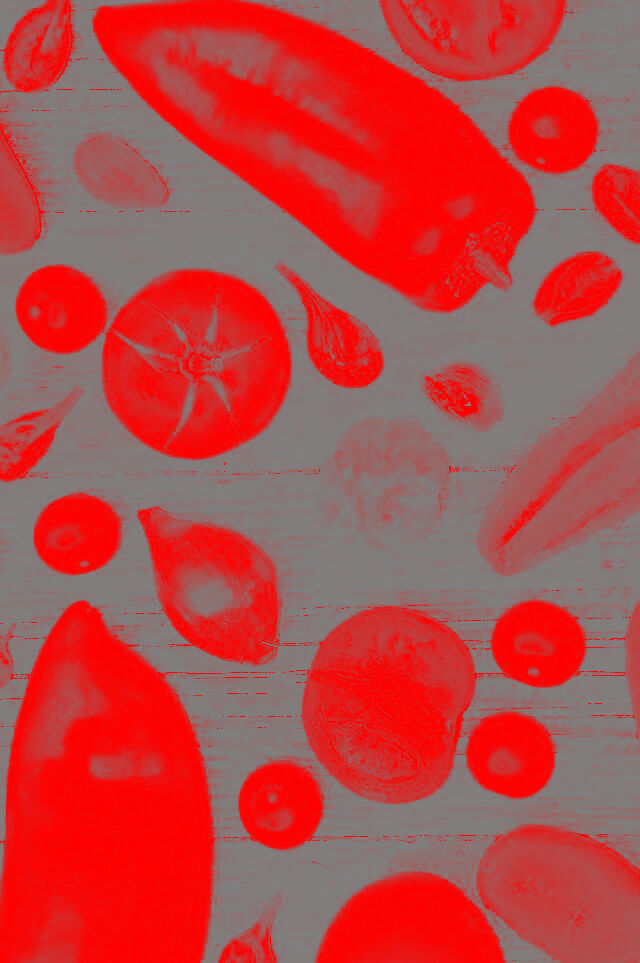 In this example, we investigate the color saturation of different vegetables in a PNG image. To do this, we convert the PNG into the saturation channel of the HSL color model. As a result, we find that the peppers and tomatoes have the highest saturation, while the garlic has the lowest saturation. (Source: Pexels.)