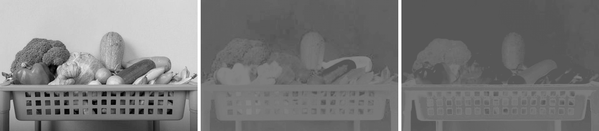 In this example, we split a PNG image of a basket of vegetables into all three LAB channels and display them in grayscale. The Lightness (L) channel emphasizes the luminance (brightness) of each vegetable, while the A and B channels reveal the color spectrums in terms of red-green and blue-yellow content. The grayscale filter helps us focus on the relative intensity distribution within each LAB channel instead of the spatial encoding of luminance and chromaticity. (Source: Pexels.)