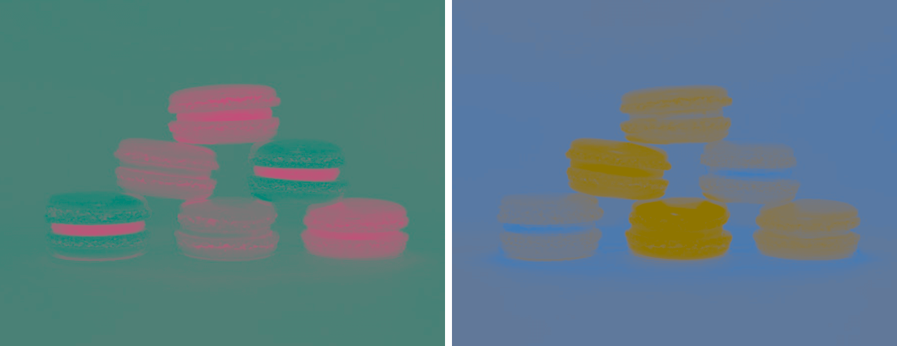 In this example, we convert a PNG image of colorful macaroons into "A" and "B" channels from the LAB color space. The "A" channel highlights the red and green variations in the macaroons, while the "B" channel reveals the blue and yellow components. By visualizing both channels side by side, we can analyze how chromatic components are spatially distributed in the image and contribute to the overall color palette. (Source: Pexels.)