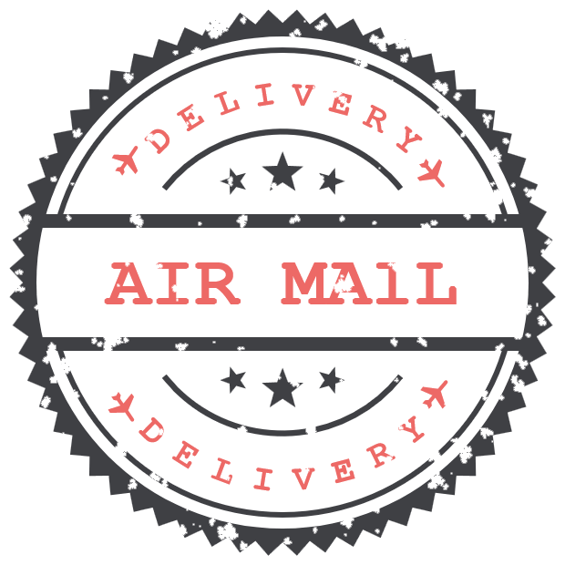 In this example, we generate a stylish "AIR MAIL" stamp for marking international mail packages. The stamp has a round shape with an inner text banner for the main text. Besides decorative lines and stars, we also add small Unicode airplane emojis ✈ to it. The stamp uses two colors – "LightCoral" for the primary and secondary text and "DarkSlateGray" for the border and decorations. The text family is set to the typewriter-style "Courier New" font that gives it an old-school mail look.