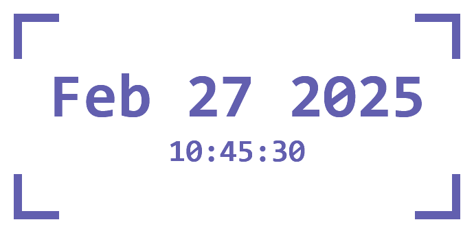 In this example, we create a stamp with today's date and time. Such stamps are useful for tracking documents over time, keeping official records, and marking urgent same-day approvals. The primary text line on the stamp displays the current date, while the secondary text line shows the exact time. The design is minimalist, with no borders but only corner markers. The date and time are printed in monospace font and blue ink color. To make sure the stamp's text never hides anything important in documents, we make the stamp slightly transparent by setting its opacity to 80%.