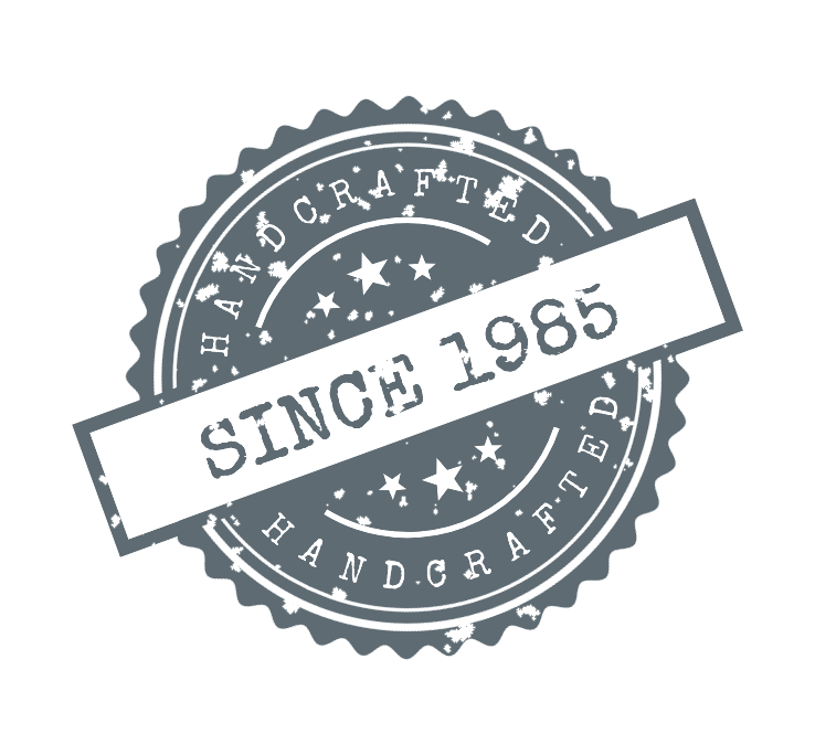 This example generates a circular badge with the text "HANDCRAFTED SINCE 1985". The main text in the middle says "SINCE 1985", highlighting the long history of our brand, and the additional text says "HANDCRAFTED", signifying the time-tested quality and tradition of our products. The badge's design features a wavy border and decorative stars that separate the main and secondary text. The stamp is filled with a solid dark gray color but remains slightly transparent (20% transparent and 80% opaque). Additionally, the stamp has a custom tilt of 20 degrees and a quality setting of 70%, giving it a damaged ink look and a slightly aged effect.