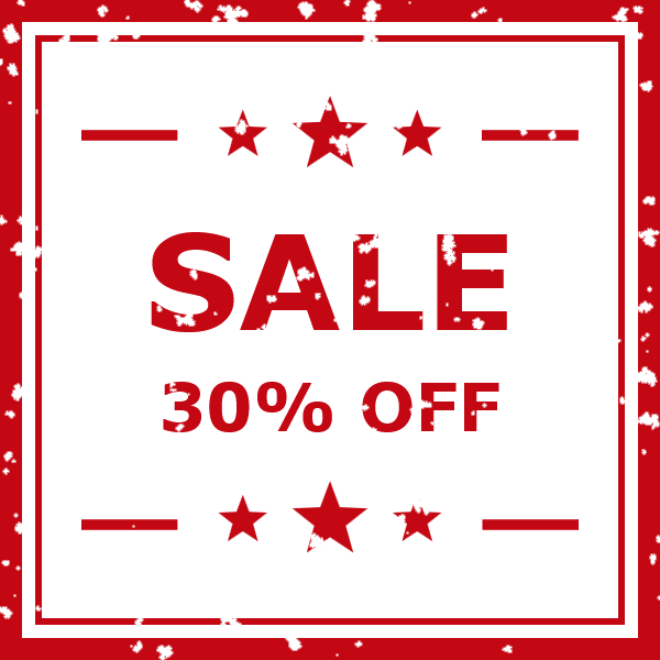 This example generates a square stamp of dimensions 600-by-600 pixels, featuring a special offer in our store. It uses 120-pixel text "SALE" in Verdana font as the main text and additional text that says "30% OFF". The stamp is printed in a vibrant red color on on a white background, and it's decorated with extra lines and stars. The quality is set to 75%, adding some realistic imperfections to it.