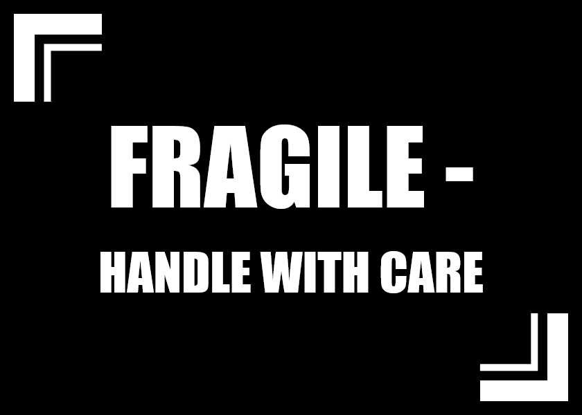 In this example, we create a white marking stamp placed on a black background. The stamp has bold, all-caps warning text that says "FRAGILE - HANDLE WITH CARE", written in the Impact font at the size of 150 pixels. It has a simple design with double-corner borders in the top left and bottom right. This stamp works great on black shipping boxes, as the white ink ensures high visibility on dark surfaces.