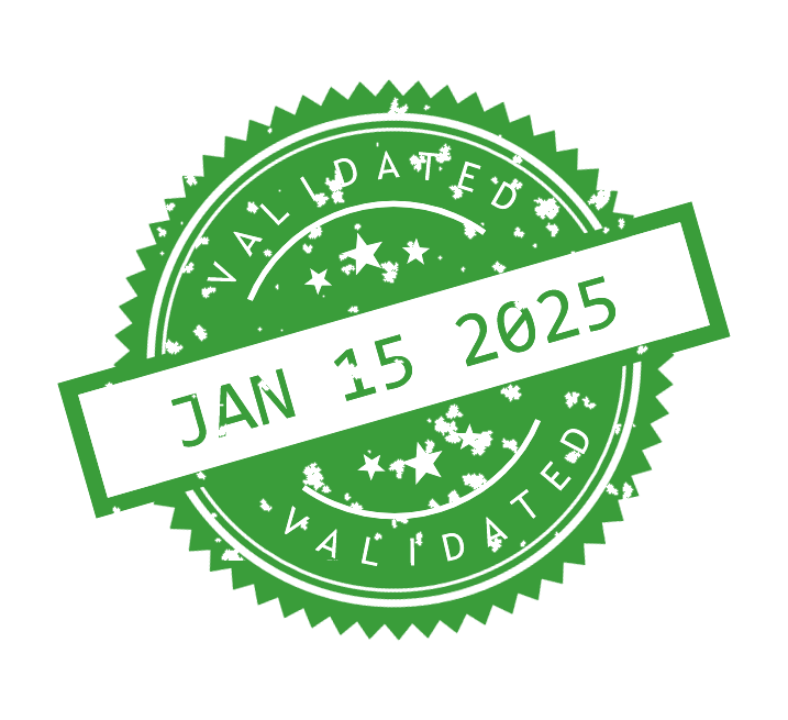In this example, we generate a digital seal containing only the date of a validated document. For the seal's design, we select a round shape with a banner message and a spiky border, all colored and filled in green. The seal includes the validation date "Jan 15 2025" and a "VALIDATED" label, making it ideal for putting on documents. The seal's inner areas are color-filled, the "VALIDATED" label is inverted, and it contains star and line patterns. The seal has a quality setting of 70%, making it look old and faded. We also rotate the seal by 16 degrees to give it a slightly tilted look and set the opacity to 80% (making it 20% transparent). The 80% opacity creates a see-through version of the seal that appears semi-transparent when placed on a document.