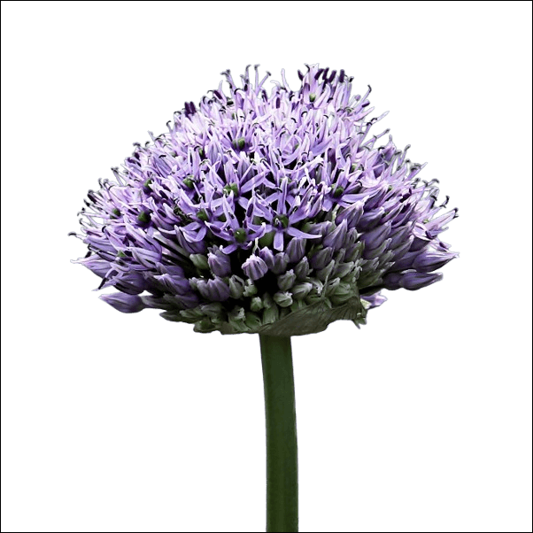 This example converts a rectangular PNG of a purple allium flower with a transparent background into a square PNG, also retaining the transparent background. The input image has dimensions of 471x660 pixels, with the vertical flower occupying most of its height. To achieve a perfectly square shape while ensuring the entire flower fits within the frame, we extend the square cropping area beyond the original PNG's boundaries. The square's size is set to 600 pixels, and the area is shifted -60 pixels to the left. This means new transparent areas are automatically added to the left and right of the flower to maintain the square aspect ratio. To visually define the boundaries and square form of the output PNG, we add a thin 1-pixel black border to the new square PNG. (Source: Pexels.)