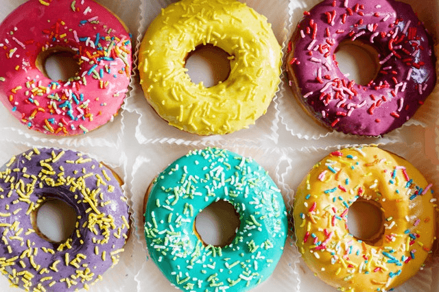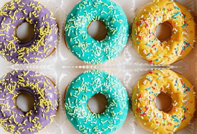 In this example, we load a PNG file with a box of colorful donuts and apply the reflection along a horizontal line that goes through the center of the box. The horizontal line is drawn at the position y = 207 and it reflects the bottom donuts upwards. Now we have two rows of donuts of the same color at the top and bottom. (Source: Pexels.)