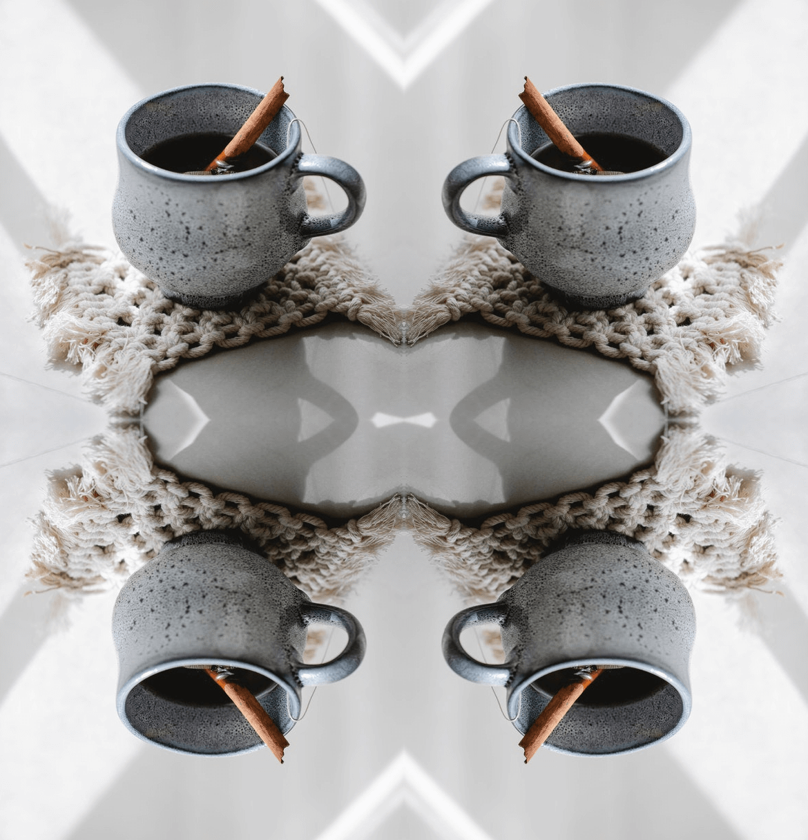 In this example, we open a PNG format image that's already symmetric along the vertical axis. In addition to this, we also make it symmetric along the horizontal axis by mapping a copy of the image at the line y = 0. As a result, we get a central-symmetric image with four tea mugs. There are eight symmetries in this image that go horizontally, vertically, and diagonally (twice – along both diagonals). (Source: Pexels.)