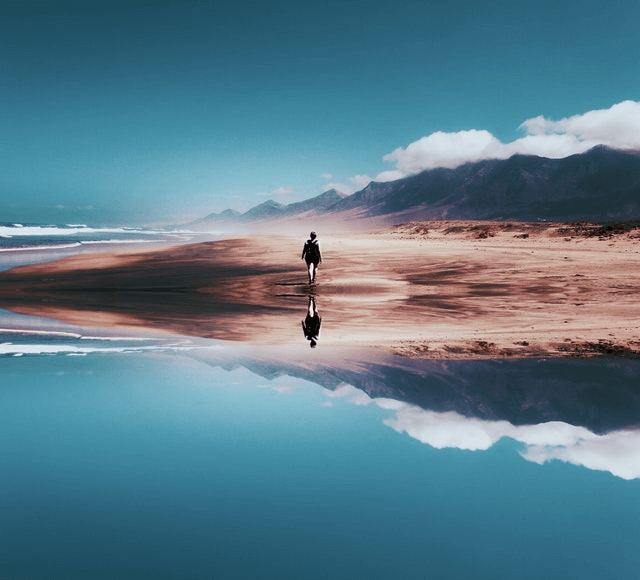 In this example, we switch to the horizontal symmetry mode and create an illusion of a person walking on a mirror lake. To do this, we move the horizontal axis to the position 290 and draw the top part of the image at the bottom. The width of the image does not change, but the height becomes equal to 290×2 = 580px. (Source: Pexels.)