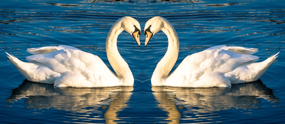 This example runs our symmetry program on a single PNG image of a white swan to make a symmetric swans-in-love composition. It places the vertical symmetry axis next to the swan's beak and copies a reverse mirror copy of the swan over to the right side. As a result, we get two swans in love that form a heart with their necks in the center of the image. (Source: Pexels.)