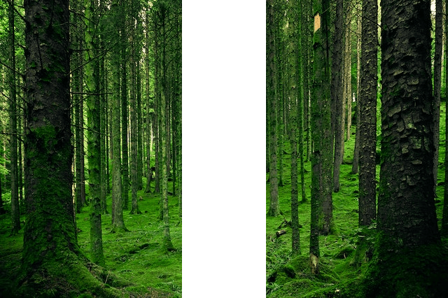 In this example, we cut out a vertical strip across the entire height of a PNG of trees in a forest. This trick lets us visually split the photo in half and separate it into two vertical left-and-right pictures. It's still a single PNG but the man in the woods has disappeared. (Source: Pexels.)