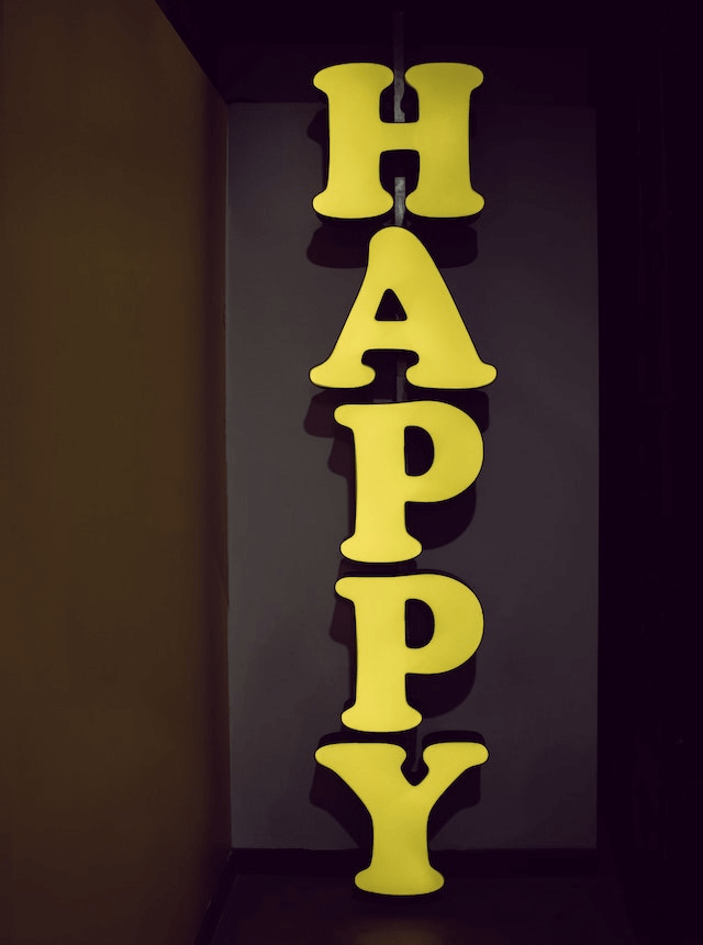 In this example, we extract the word "Happy" from a display sign. Since the letters have many shades of yellow, we match the average yellow color "rgba(215, 197, 61, 255)" and all tones that are at most 25% similar. In the output, we want to get the label as a single color, so we fill the extracted object with the color "gold". Additionally, we draw a 4px black stroke around the letters and add a powder-blue background to the word. (Source: Pexels.)