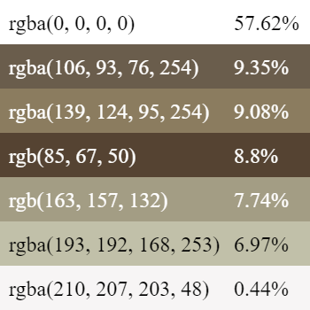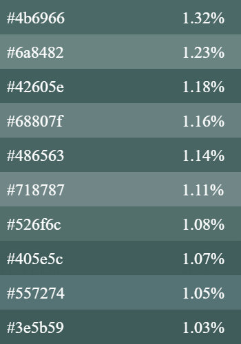This example extracts the 10 most popular colors from a PNG image. It has the "Exact Color Tones" mode active and as a result, each extracted color is exactly the same as in the picture. Besides the palette itself, it also prints the hexadecimal color names and the statistics of color usage (in percent). (Source: Pexels.)