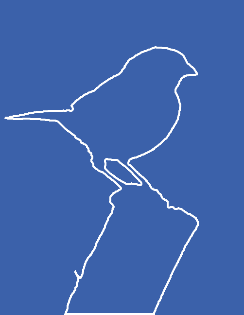 In this example, we generate a mask with a thin yet highly accurate outline around a bird PNG. The outline thickness is set to 4 pixels and is drawn along the inner edge of the bird and the branch, keeping the outline size identical to the original object. The alpha threshold is set to 0, meaning all pixels, including semi-transparent ones, are included in the contour. The outline is white against a RoyalBlue (#3b61aa) background with smooth edges enabled. (Source: Pexels.)